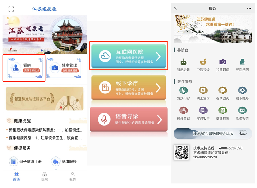 下载“江苏健康通”APP,点击“看病”模块,选中“互联网医院”进入服务页面。
